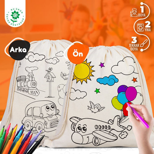 Boyanabilir Araba Uçak Büzgülü Bez Çanta - Kalemli