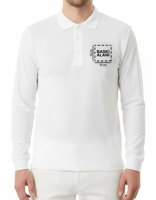 Baskılı Polo Yaka Uzun Kol Beyaz Tişört