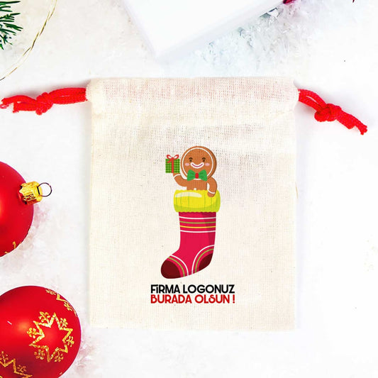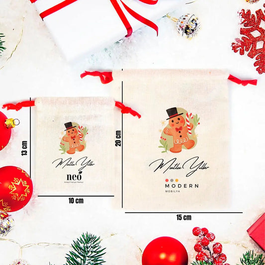 Yılbaşı Kurabiyesi Baskılı Bez Kese Modeli - Renkli İp (Özelleştirilebilir)