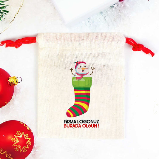 Kardan Adam Baskılı Bez Kese Modeli - Renkli İp (Özelleştirilebilir)