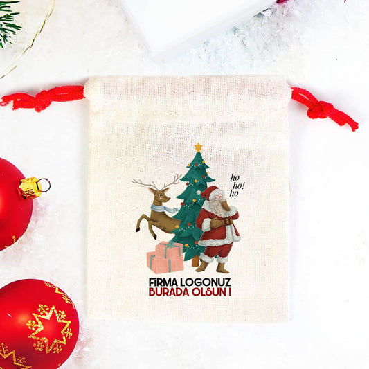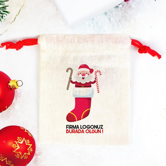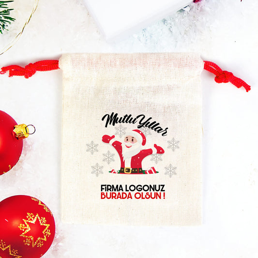 Noel Baba Baskılı Yılbaşı Hediye Kesesi - Renkli İp (Özelleştirilebilir)
