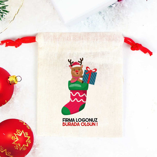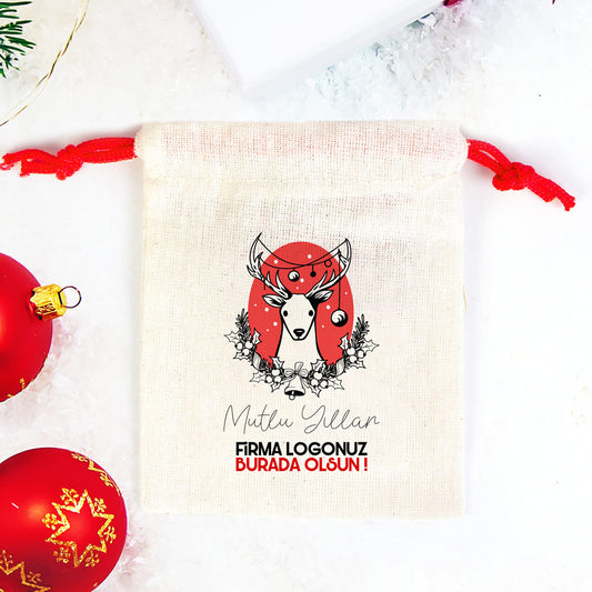 Yılbaşı Temalı Geyik Baskılı Bez Kese Modeli - Renkli İp (Özelleştirilebilir)