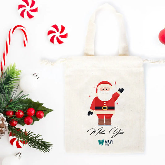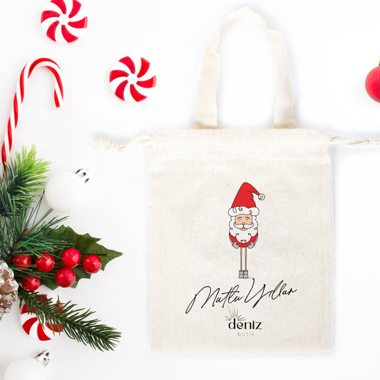 Noel Baba Baskılı Bez Kese Modeli - Renkli İp (Özelleştirilebilir)