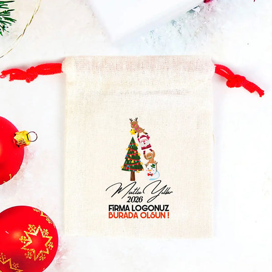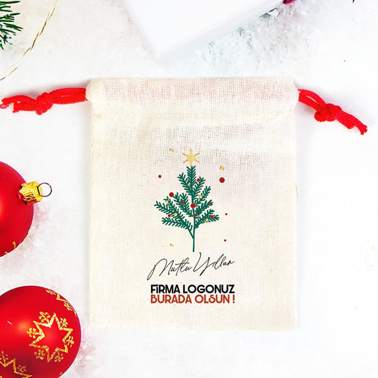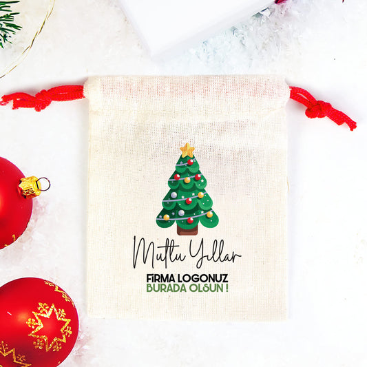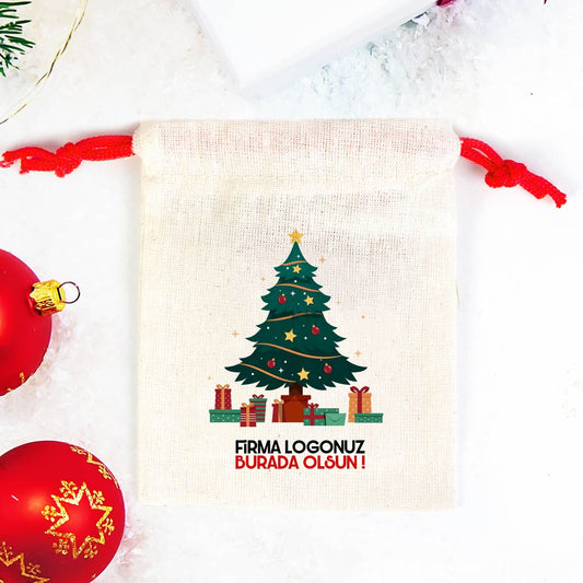 Çam Ağacı Baskılı Yılbaşı Hediye Kesesi - Renkli İp (Özelleştirilebilir)