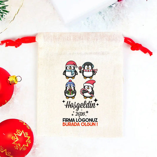 Yılbaşı Temalı Penguen Baskılı Bez Kese - 15,5x20 cm Tek Tutma Kısa Kulp (Özelleştirilebilir)