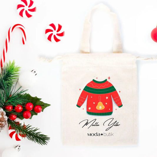 Mutlu Yıllar Hediye Paketi Baskılı Bez Kese - Renkli İp (Özelleştirilebilir)