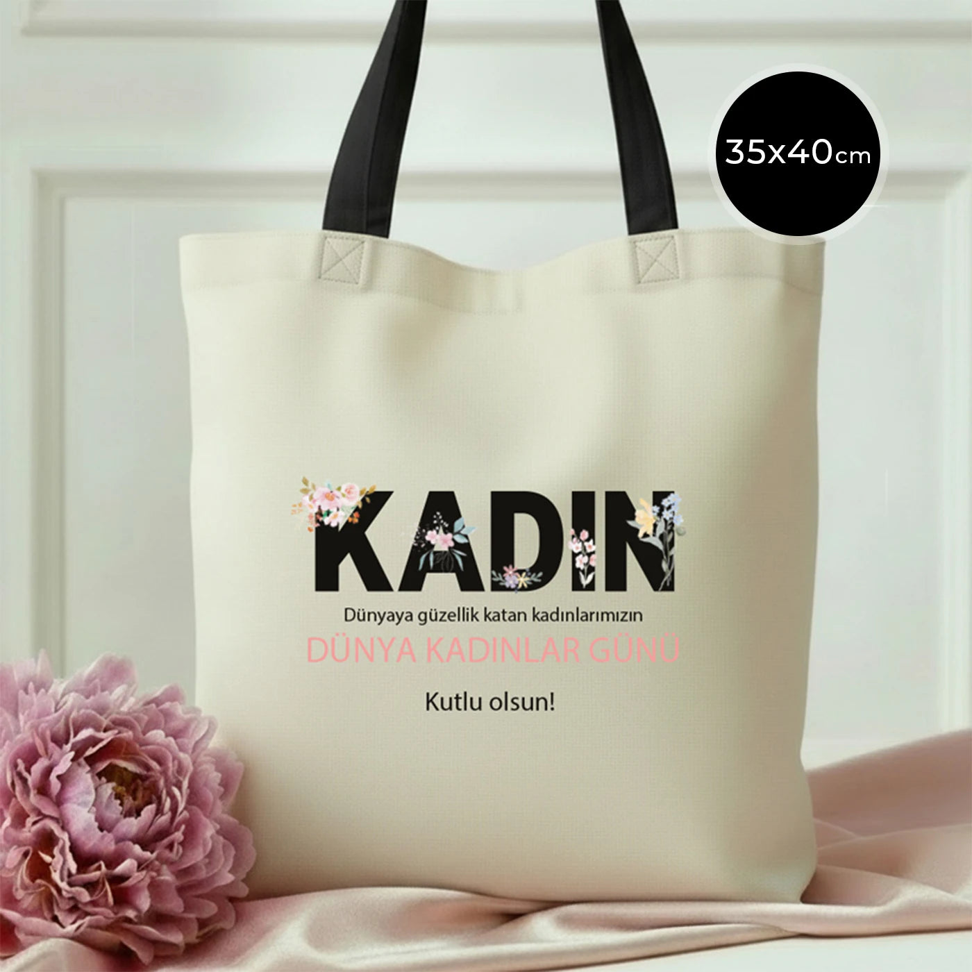 35x40 cm Siyah Kulp İç Cepli Kanvas Bez Çanta - Kadınlar Günü