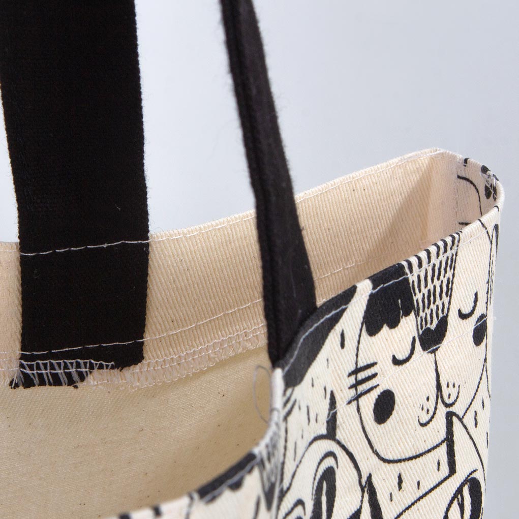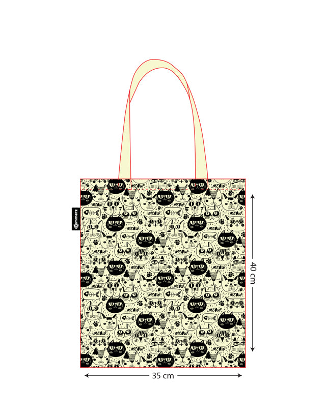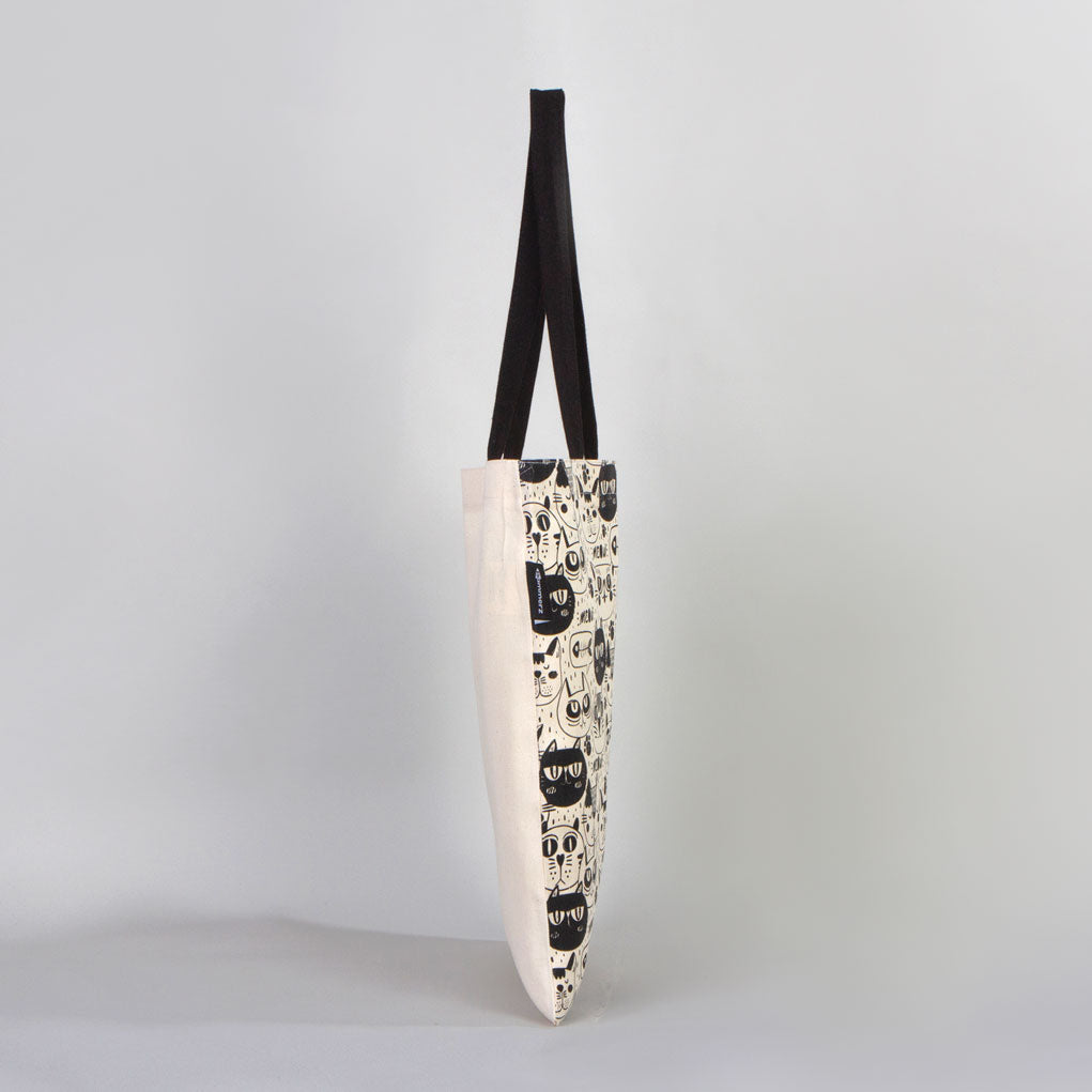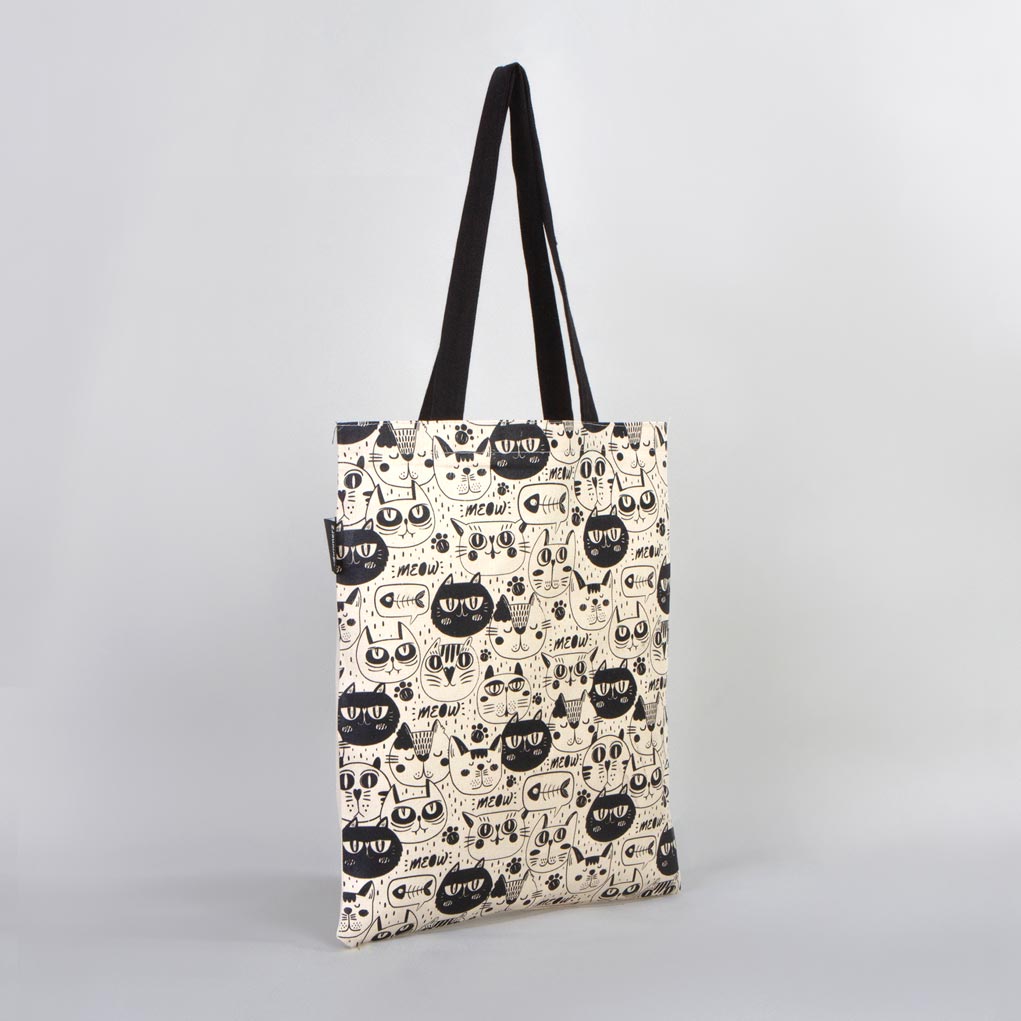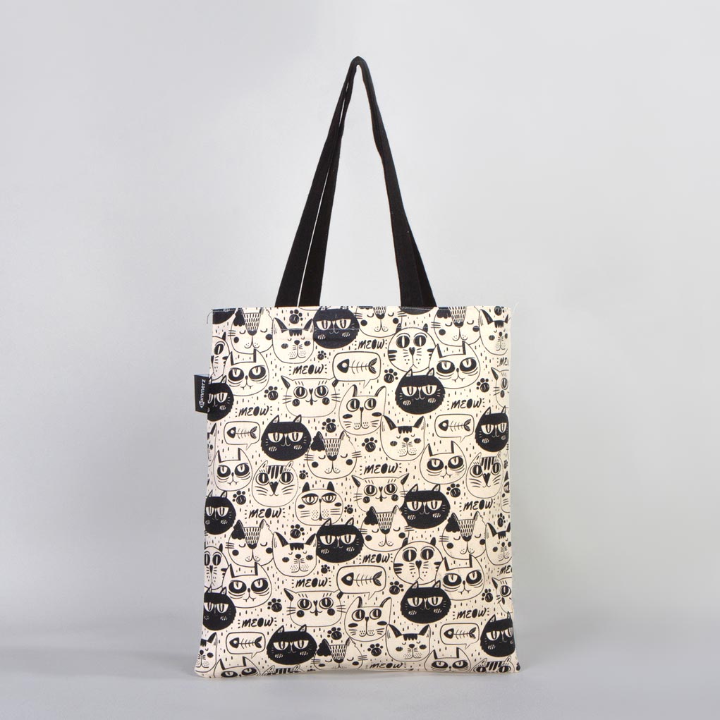 Siyah Kulp Gabardin Kedi Baskılı Bez Çanta