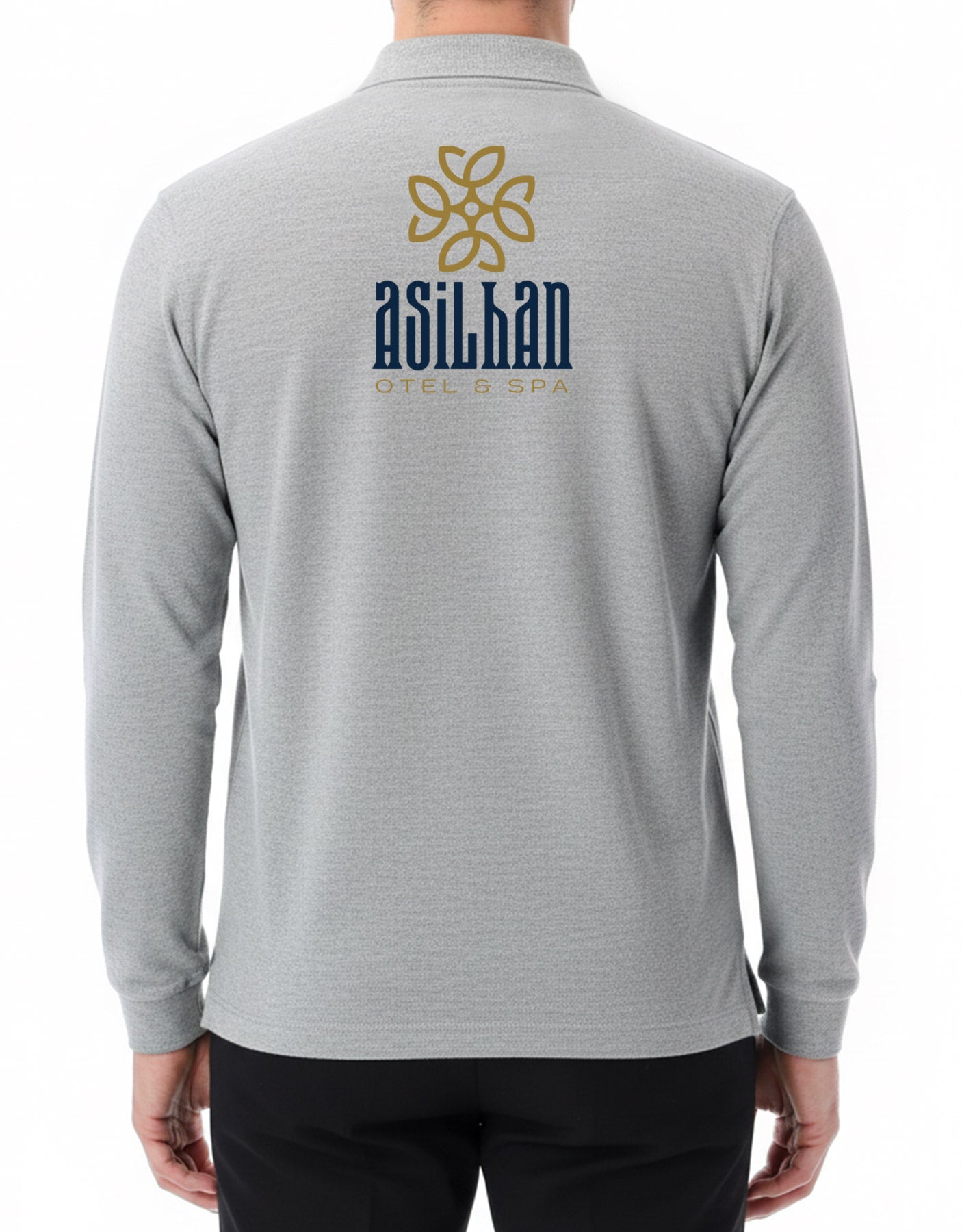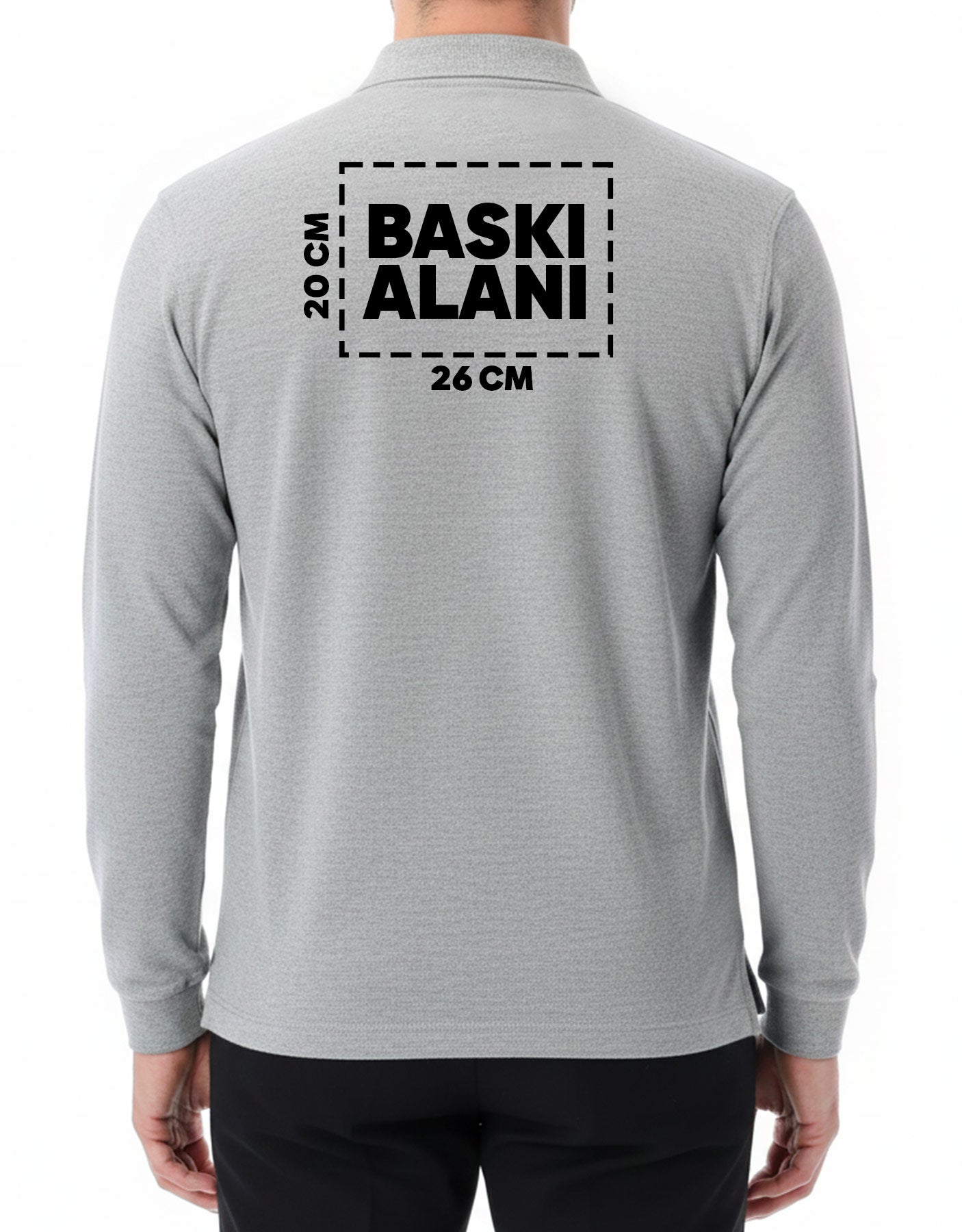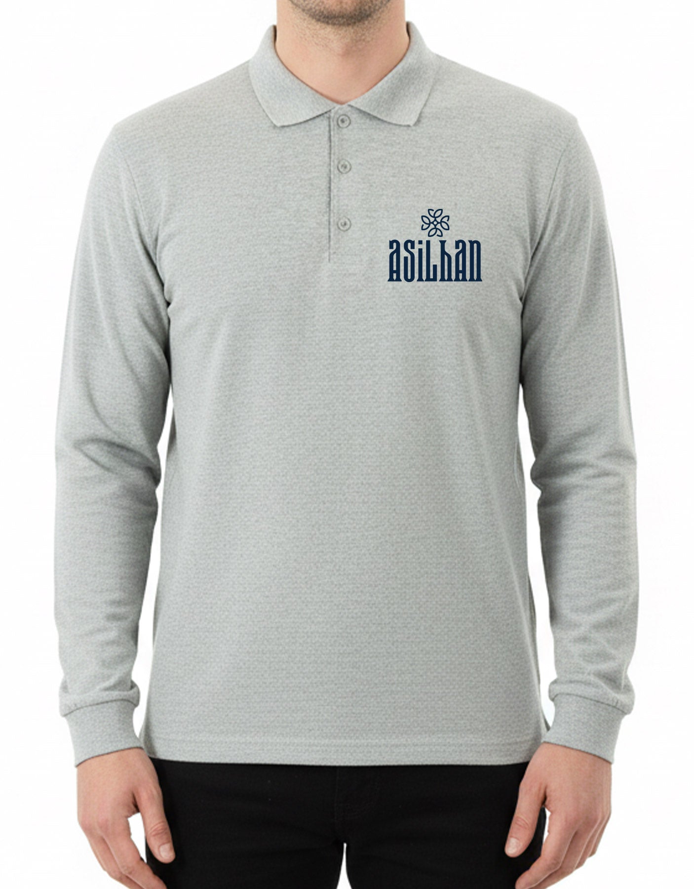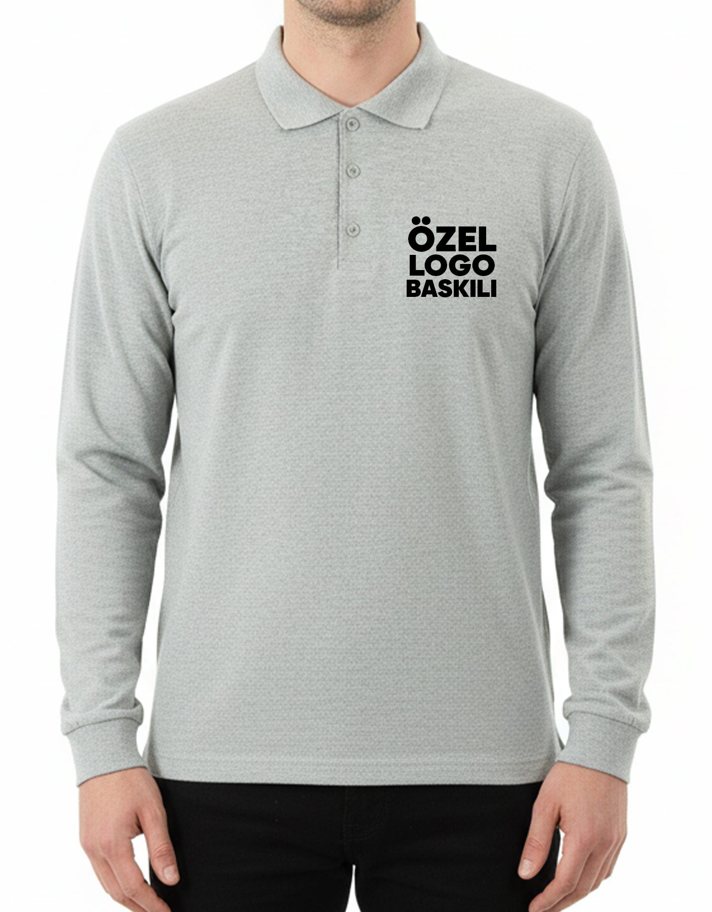 Baskılı Polo Yaka Uzun Kol Gri Tişört - Toptan