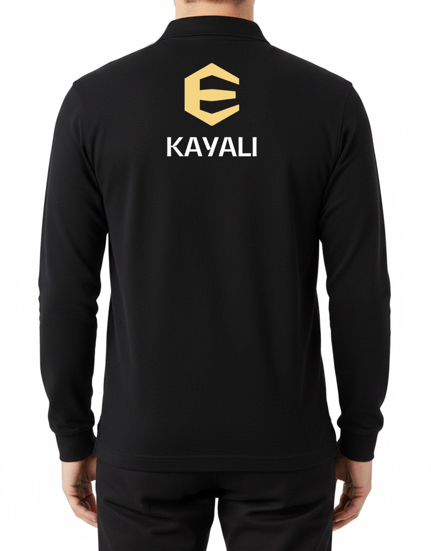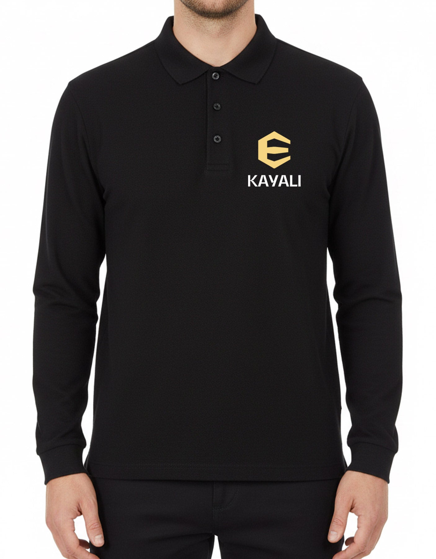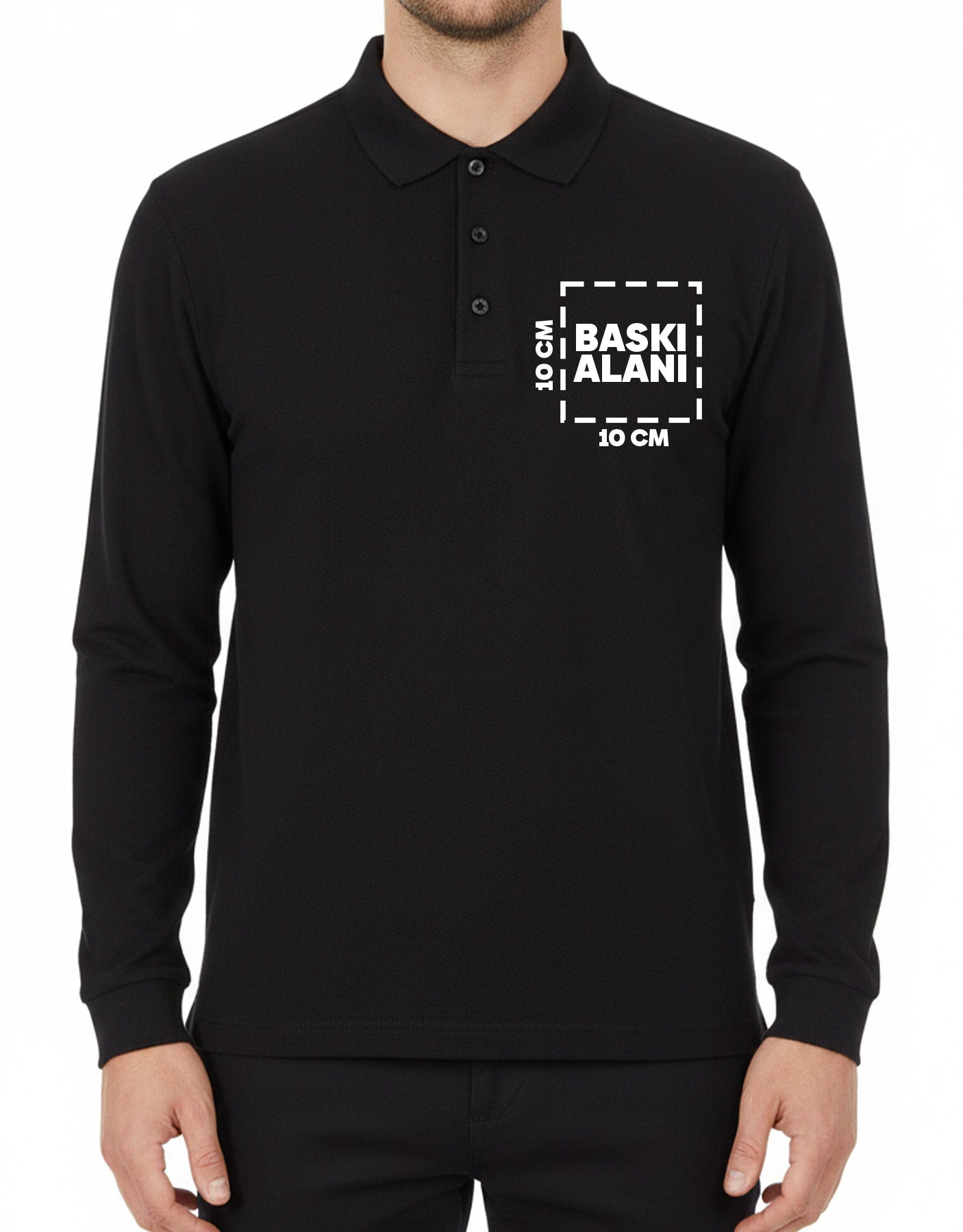 Baskılı Polo Yaka Uzun Kol Siyah Tişört
