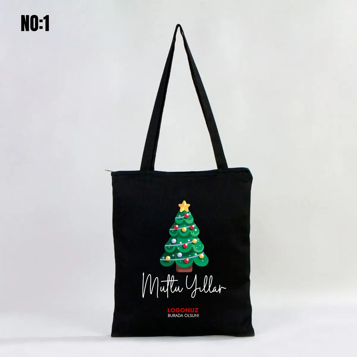 Fermuarlı Siyah Gabardin 35x40 cm Yılbaşı Bez Çanta Baskılı (Özelleştirilebilir)