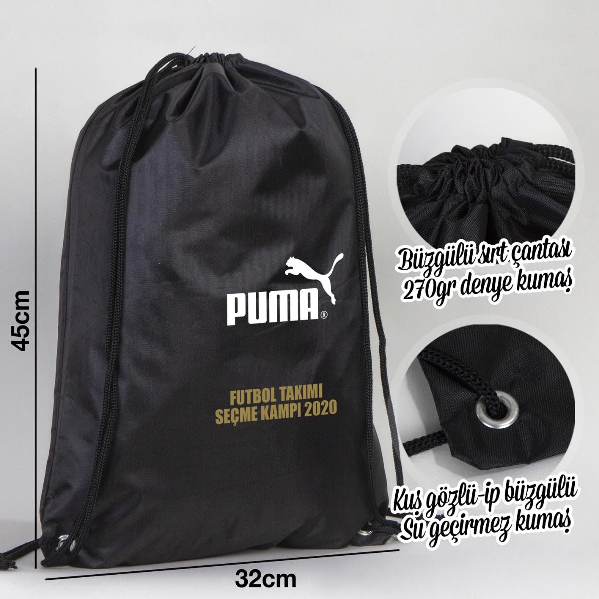 • Büzgülü imperteks sırt çantası boyutları 32x45 cm (ürünler el dikimi olduğundan +/- 1cm ölçülerinde küçük farklılıklar olabilmektedir)