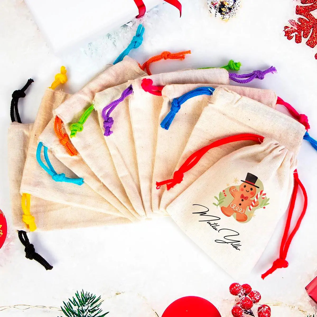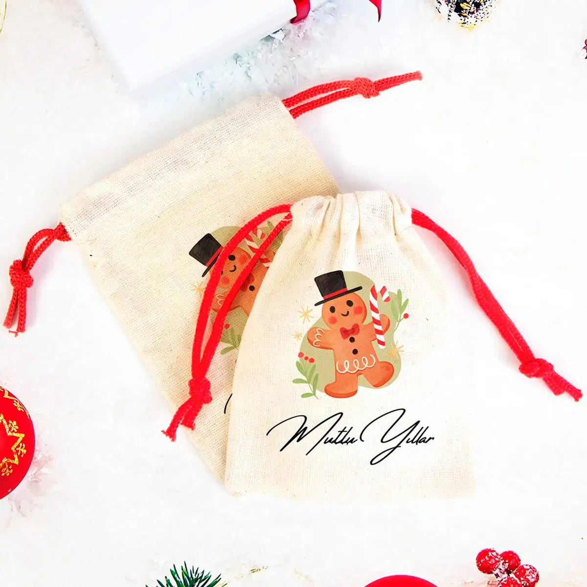 Mutlu Yıllar Baskılı Bez Kese - Kurabiye Desenli - Renkli İp (Özelleştirilebilir)