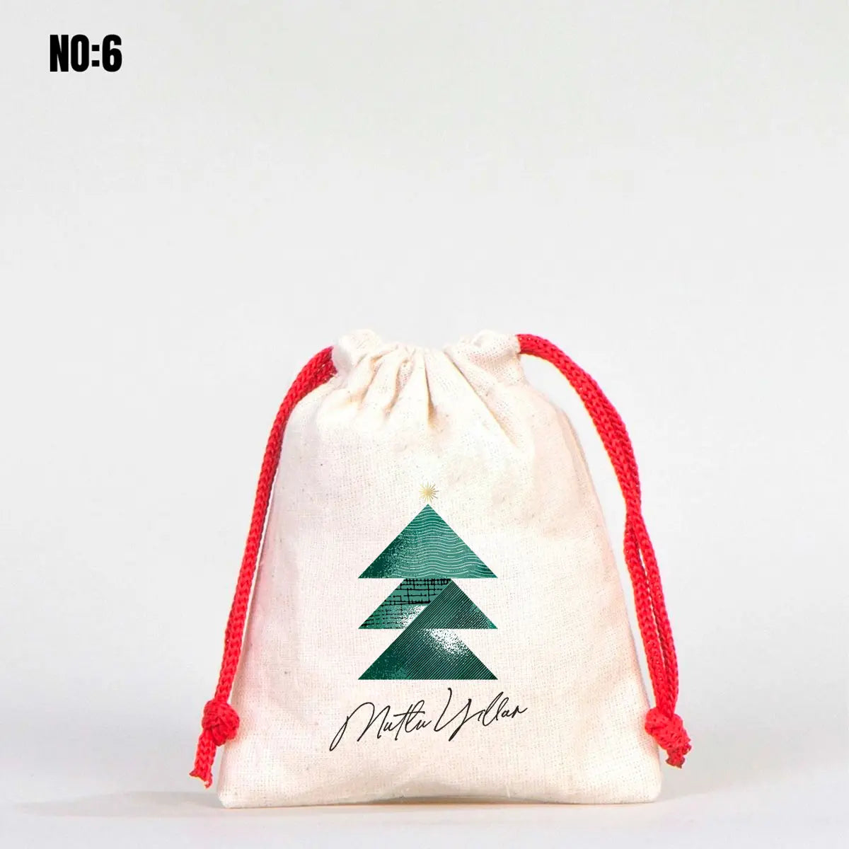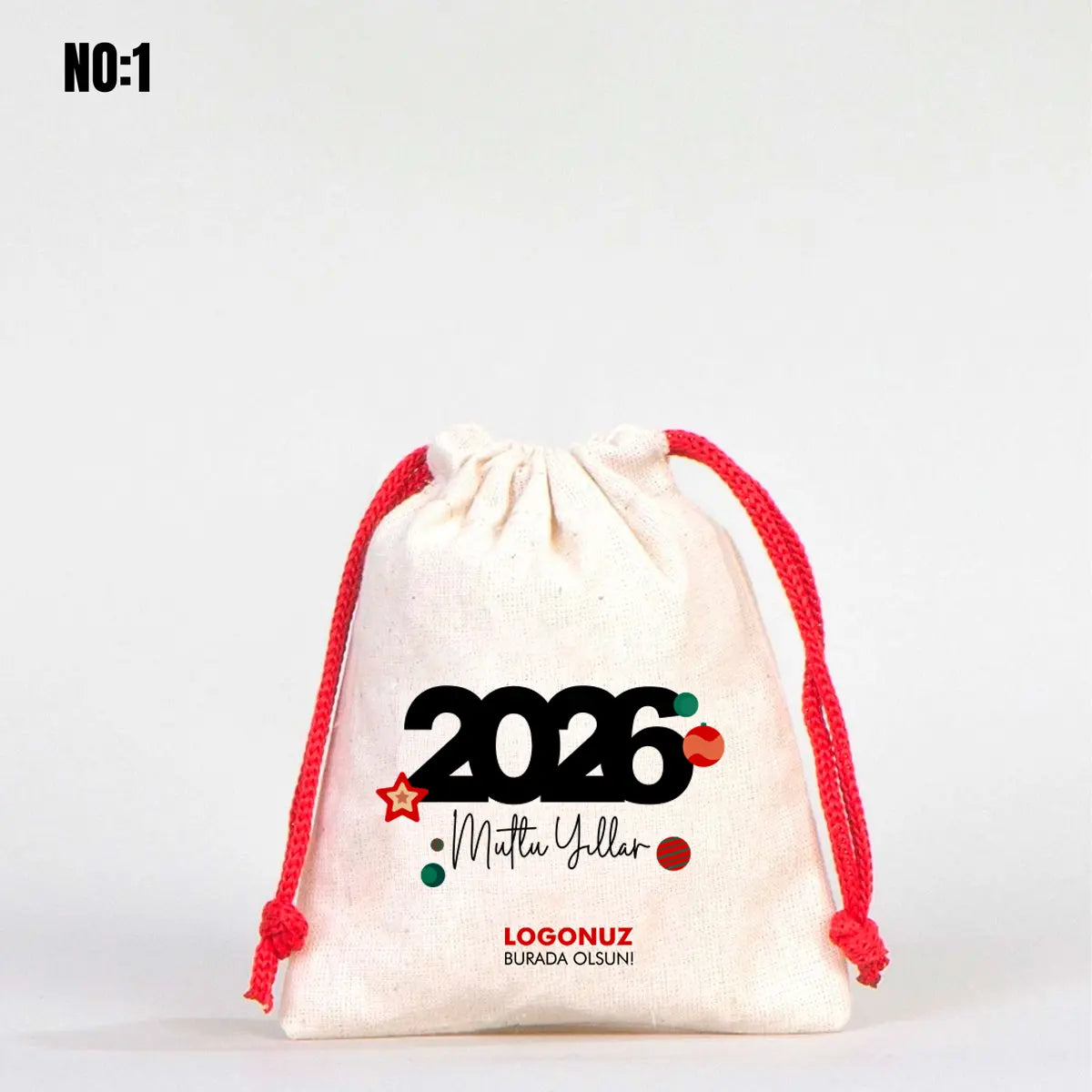 Yılbaşı Bez Kese 10x13 cm - Renkli İp - Kırmızı (Özelleştirilebilir)